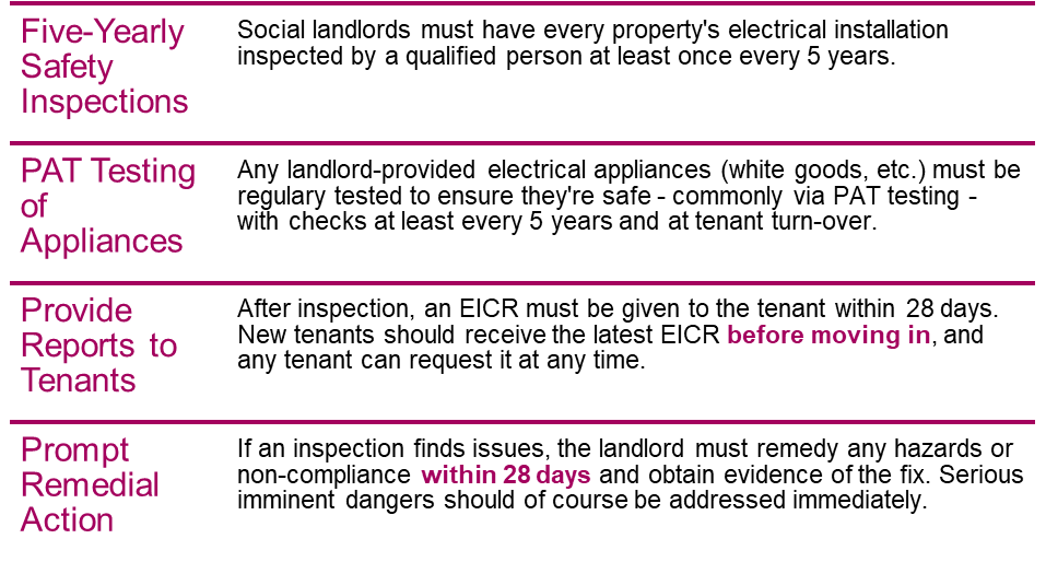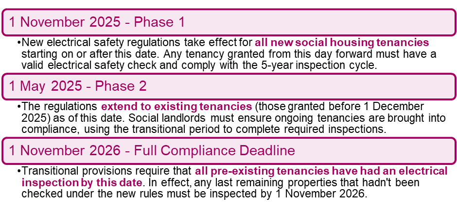 The Regulations come into force in two phases. From 1 November 2025, they apply to all new tenancies granted on or after that date. From 1 May 2026, they extend to cover existing tenancies that were granted before 1 December 2025, giving registered providers a transitional period to bring previous arrangements into compliance. By 1 November 2026, all pre-existing tenancies are required to have completed an electrical inspection in accordance with transitional requirements. Properties that have not yet been inspected under the new regulations must be checked by this deadline.1 November 2025 – Phase 1